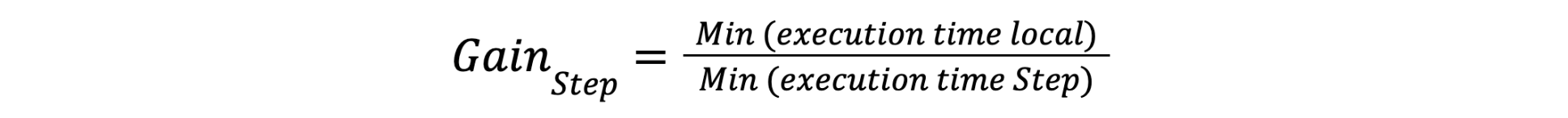 The execution time gain is defined as the ratio between the minimum execution time measured during local execution and the minimum execution time measured during execution on Step: