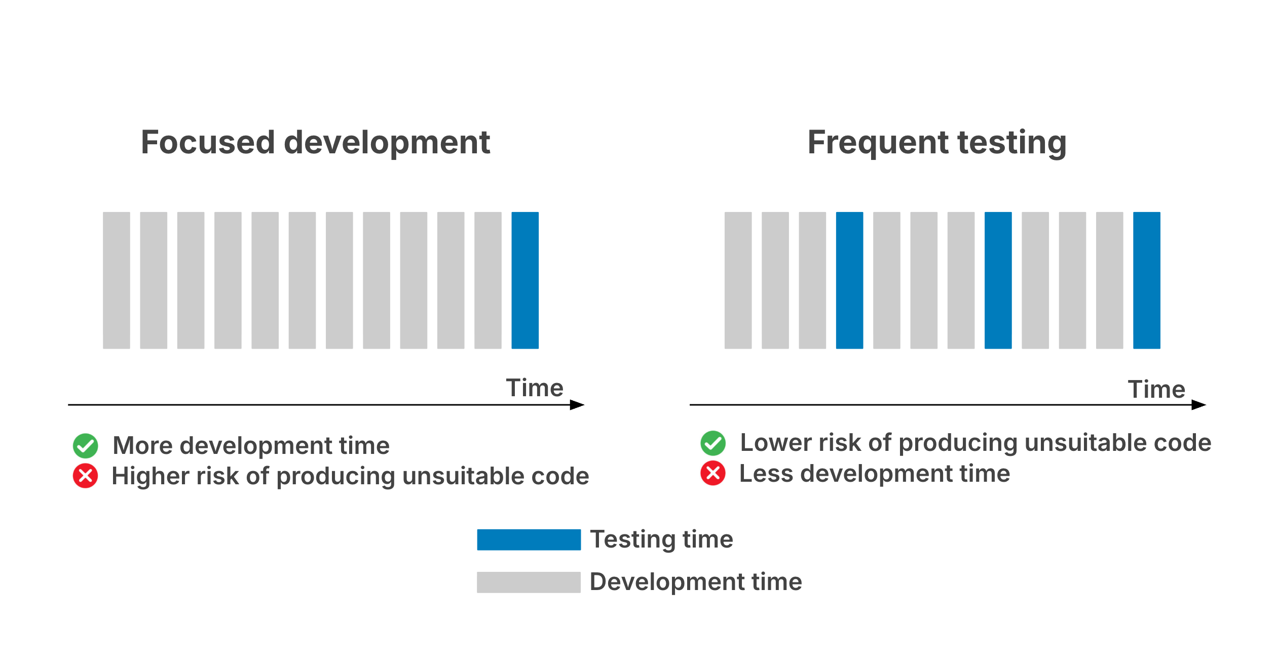 This creates a structural tension between development speed and reliability (see Figure 1). If testing is performed infrequently to preserve development time, regressions are detected late and risk increases (left-hand illustration). If testing is performed frequently, local execution time starts to dominate the workday and slows down progress (right-hand illustration). Even a modest test suite with a runtime of around 15 minutes can significantly limit the number of feedback cycles an engineer can run in a day.
