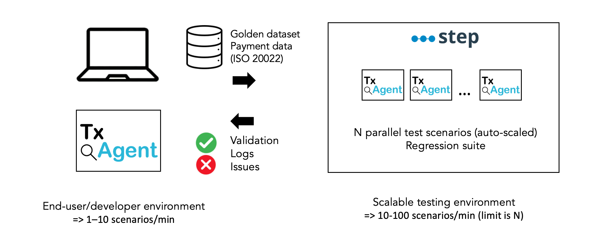 TxAgent executes complete investigations from a single input to a single output, while logging key information such as queries, workflow paths, and parameters as side artifacts. The expected outputs are validated by domain experts and stored in a golden dataset, which serves as the reference for automated testing. Additional details are available in the dedicated article “TxAgent: An ISO 20022 AI Agent Industrialized with Massive Parallel Testing” [1].