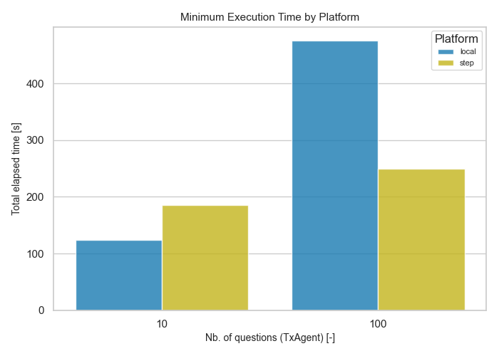 The situation changes when moving to the larger test set of 100 scenarios. In this configuration, the advantages of using Step become clear. Parallel execution across multiple instances significantly reduces total execution time compared to the fastest achievable local run. As detailed in Appendix A, the observed execution time was reduced by approximately a factor of 2 under the tested conditions.