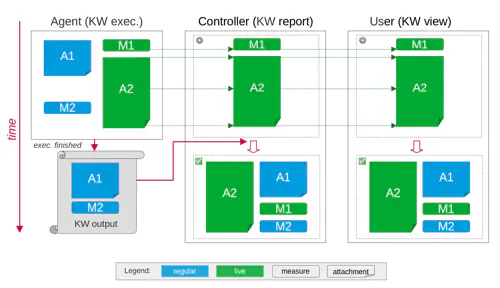 To address these issues, Step 29 introduces an alternative way to report results, named Live Reporting. It is a way to get results at the moment they are produced, without having to wait for the keyword execution to finish. Another established name for this kind of behavior, in particular for files, is “Streaming”. In the following, we use both terms interchangeably. We’ll refer to the existing and established way of returning results (attachments / measurements) at the end of the execution using the term regular or traditional, to distinguish the behavior from the live/streaming one.